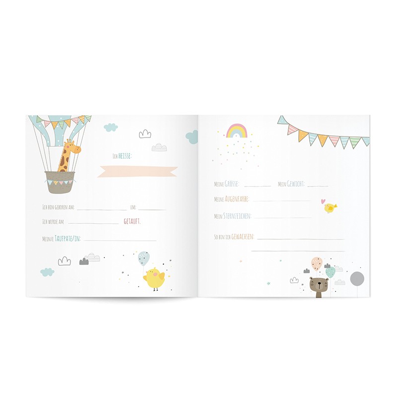 Das Besondere ist zu Beginn kann auf 4 schön illustrierte Seiten die wichtigsten Merkmale des Neugeborenen eingetragen werden.