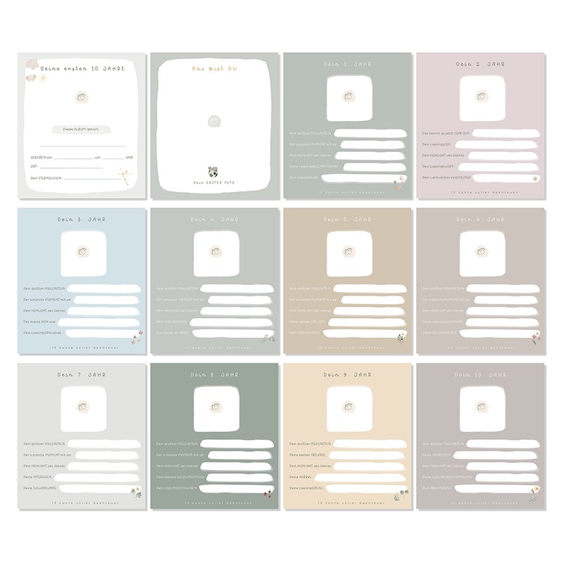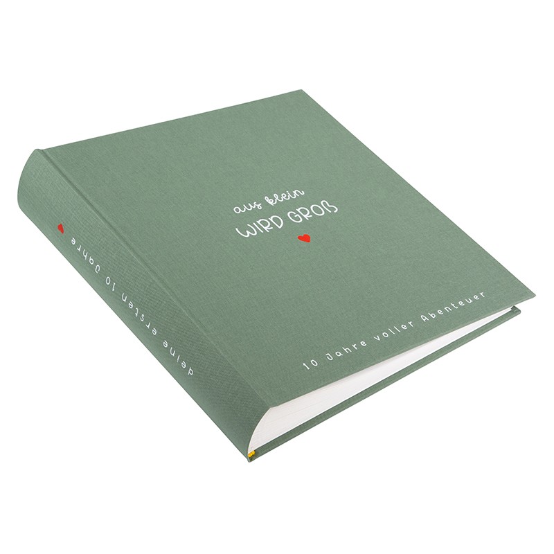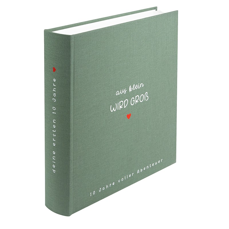 Dieses edle Fotoalbum (30 x 31 cm) mit Leinen Cover und Weißprägung bietet auf 100 weißen Seiten mit Pergamin Platz für bis zu 400 Fotos (10 x 15 cm). Eine besondere Neuheit: 12 lose, farbig illustrierte Seiten zum freien Gestalten und Einkleben. Der breite Buchrücken sorgt für eine flache, elegante Form, auch bei vielen Fotos. Hochwertig verarbeitet und Made in Germany, ideal als stilvolle Erinnerung für die schönsten Momente jedes Lebensjahres. Perfekt für Eltern, die 10 Jahre voller Abenteuer und Veränderungen stilvoll festhalten möchten.