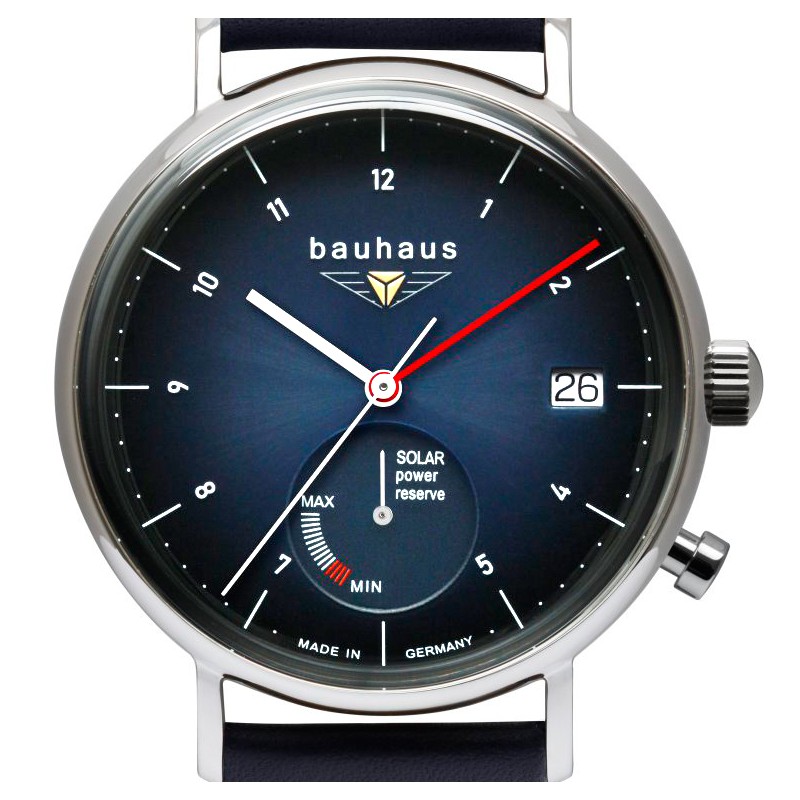 Das Modell Ref. 21123 „Solar Powerreserve“ versprüht minimalistische Eleganz und glänzt bei genauerer Betrachtung durch zahlreiche Details wie das blaue Sonnen-Zifferblatt, die zweifarbigen Zeiger und die schlanken Bandanstöße an dem geschmeidigen Gehäuse aus poliertem Edelstahl. Höchste Qualitätsansprüche erfüllt auch das SII VR43B Uhrwerk sowie das edel abgerundete, speziell gehärtete K1-Sicherheitsglas und das handgearbeitete italienische Lederarmband mit „bauhaus“-Prägung.