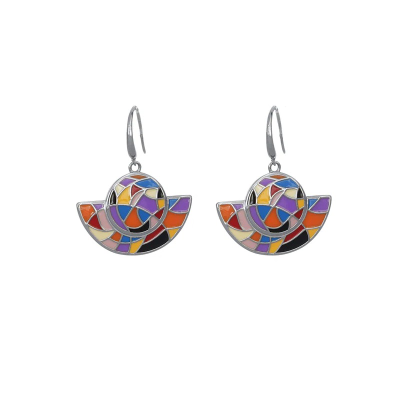 Die Elasticità Hanging Earrings verbinden silberfarbene Ohrhaken mit ausdrucksstarken Anhängern, deren dynamisches Mosaik-Design Bewegung und Balance symbolisiert. Ein modernes Schmuckstück für alle, die Farbe und klare Formen stilvoll kombinieren möchten.