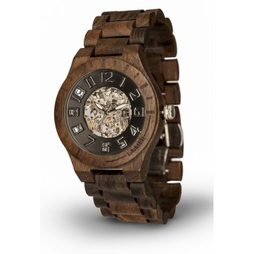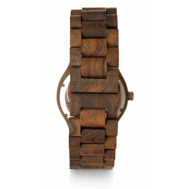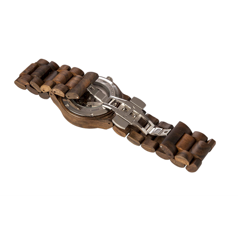 Der Gehäusekorpus sowie das Armband bestehen aus 100% dunkles Sandelholz und sind aus einem Stück Holz gefertigt. Die Schließe dagegen ist aus Edelstahl. Die Zeiger sind speziell beschichtet und leuchten in der Dunkelheit nach. Das harte Mineralglas schützt die Uhr vor Beschädigung. Außerdem ist sie Spritzwasserfest; sollte jedoch beim Schwimmen, Tauchen, Duschen und Hände waschen abgenommen werden. Durch die Möglichkeit die einzelnen Kettenglieder zu entnehmen ist die Größe verstellbar und daher geeignet für jedes Handgelenk. Imprägniert mit Haut-freundlichem Material ist sie auch geeignet für Allergiker. Sie bedarf keiner speziellen Pflege.