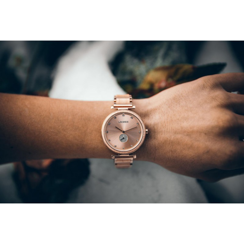 Die Uhr Miriam ist eine zierliche Schönheit aus Ahornholz, Edelstahl und Swarovski Kristallen. Sie ist federleicht zu tragen und ein besonderer Eyecatcher der zu jedem Outfit passt. Das harte Mineralglas schützt die Uhr vor Beschädigung. Außerdem ist sie Spritzwasserfest, daher für Sport geeignet; sollte jedoch beim Schwimmen, Tauchen, Duschen und Hände waschen abgenommen werden. Durch die Möglichkeit die einzelnen Kettenglieder zu entnehmen ist die Größe verstellbar und daher geeignet für jedes Handgelenk. Imprägniert mit Haut-freundlichem Material ist sie auch geeignet für Allergiker. Sie bedarf keiner speziellen Pflege. Die Uhr wird in einer schönen Holzbox geliefert.