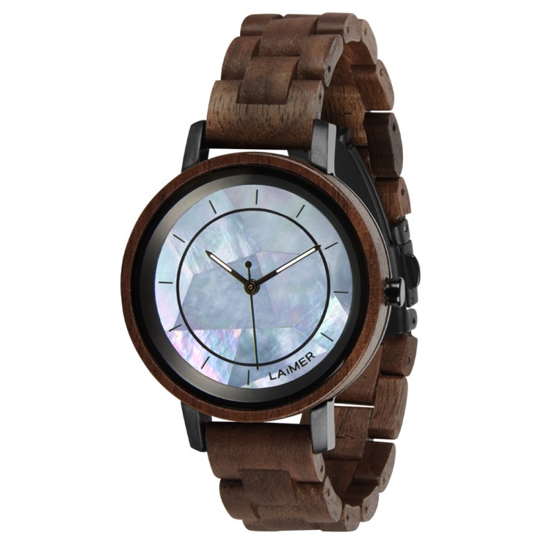 Unsere KRISTINA wurde inspiriert von den herrlichen Farben der Muscheln vor der Amalfi Küste. Sie ist dank ihrem zartblauen Perlmutt Zifferblatt, den schwarzen Akzenten und dem dunklen Nussholz ein richtiger Blickfang. Besonders raffiniert ist hier das Muster im Zifferblatt: es besteht aus recycelten Perlmutt Splittern. Außerdem ist sie leicht wie eine Feder und äußerst angenehm zu tragen.