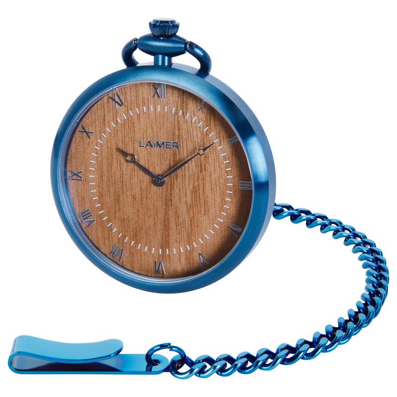 Lässig, lässiger, Taschenuhr! In der Kombi aus Nussholz und Blauen Edelstahlgehäuse macht sie jedes Outfit zu einem Hingucker.