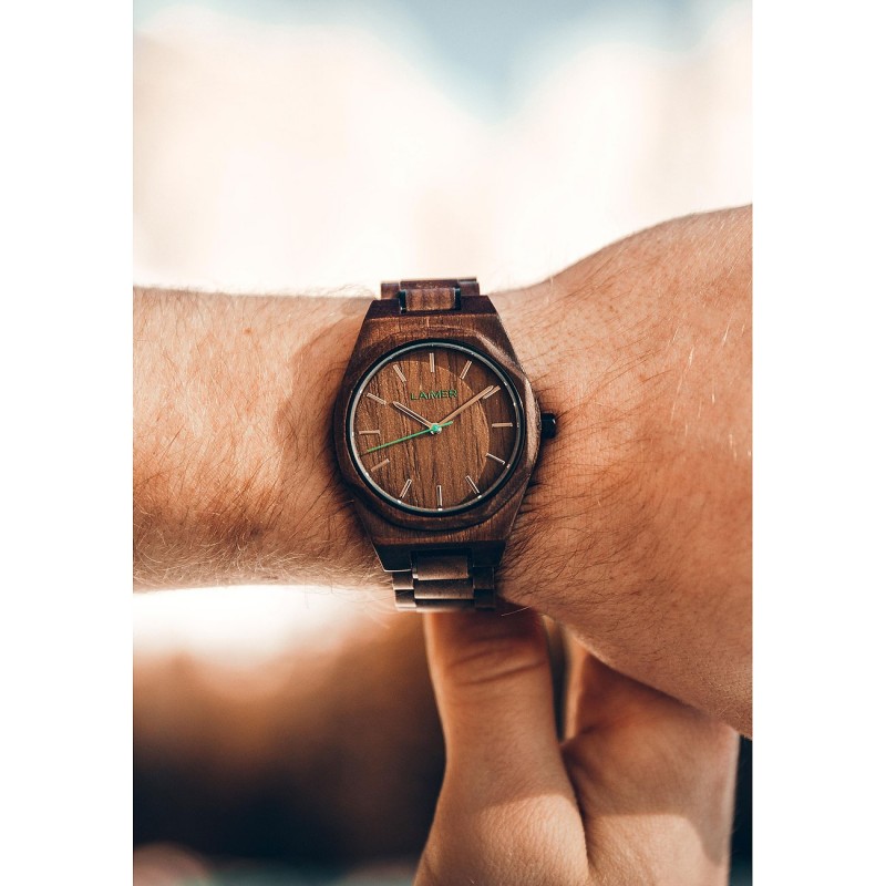 Der Gehäusekorpus sowie das Armband bestehen aus 100% Wengeholz. Die Schließe und der Gehäusekorpus dagegen sind aus Edelstahl. Das harte Mineralglas schützt die Uhr vor Beschädigung. Außerdem ist sie Spritzwasserfest, daher für Sport geeignet; sollte jedoch beim Schwimmen, Tauchen, Duschen und Hände waschen abgenommen werden. Durch die Möglichkeit die einzelnen Kettenglieder zu entnehmen ist die Größe verstellbar und daher geeignet für jedes Handgelenk. Imprägniert mit hautfreundlichem Material ist sie auch geeignet für Allergiker. Sie bedarf keiner speziellen Pflege. Die Uhr wird in einer schönen Holzbox geliefert.
