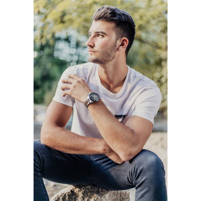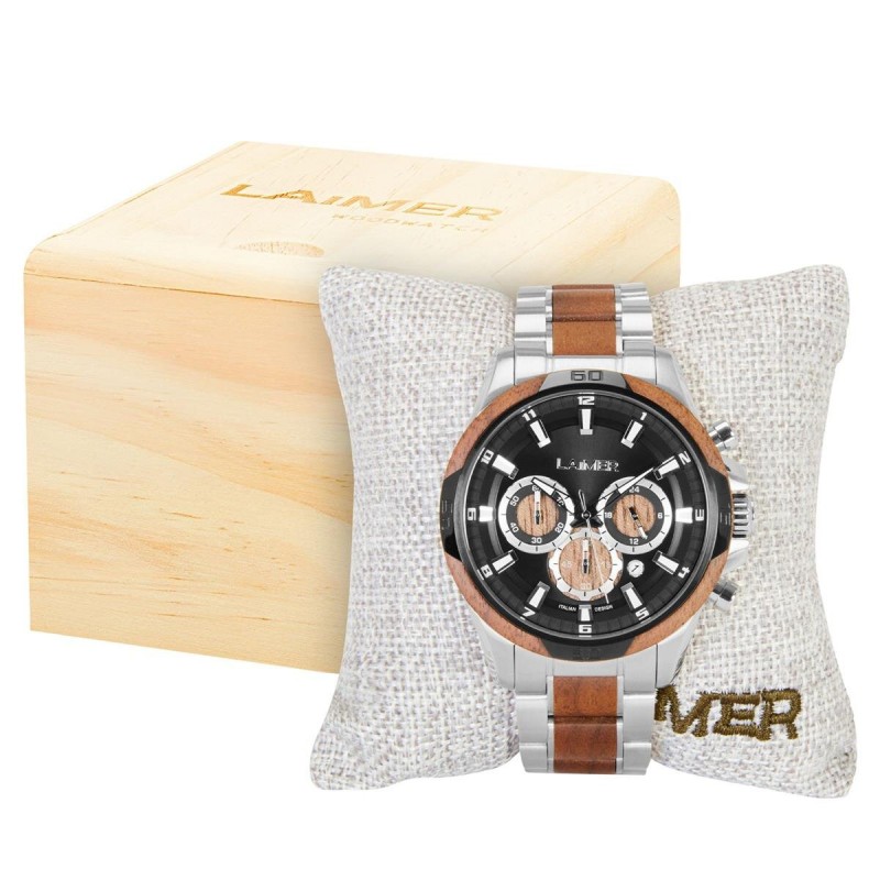 Dieser sportliche Herrenchronograph von LAiMER zeichnet sich vor allem durch das moderne Design aus, das aufgrund des schwarzen Zifferblattes in Kombination mit den Nussholz-Akzenten besonders gut zur Geltung kommt. Sowohl die Indexe als auch die Zeiger sind mit lumineszierenden Einlagen ausgestattet, die das Ablesen der Zeit auch bei Dunkelheit ermöglichen und von einem Mineralglas geschützt werden. Die Herrenarmbanduhr lässt sich hervorragend zu Ihren Outfits kombinieren und sorgt dank des hochwertigen Gliederarmbandes für einen hohen Tragekomfort.