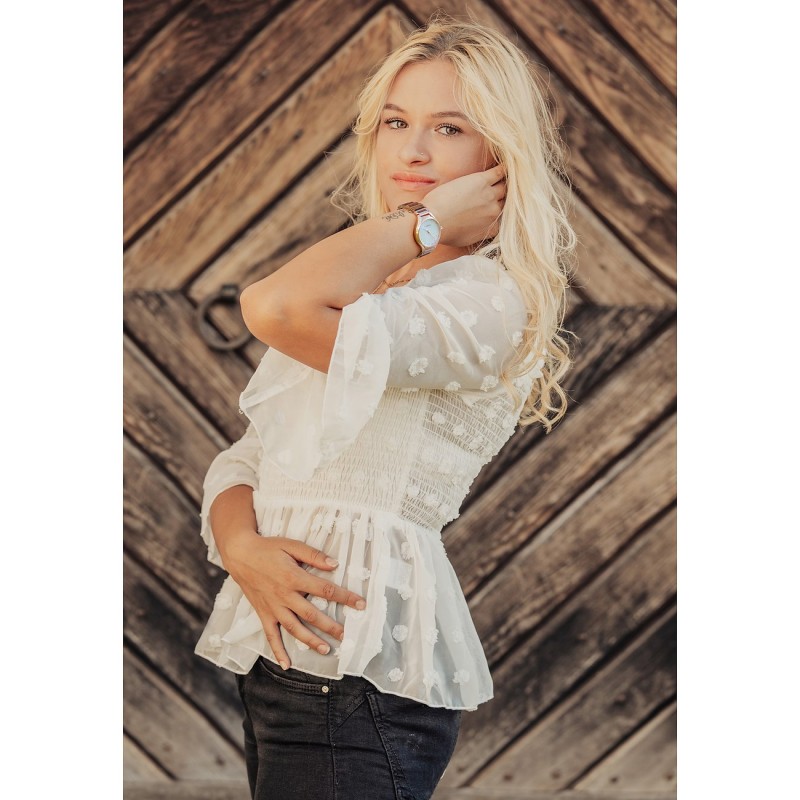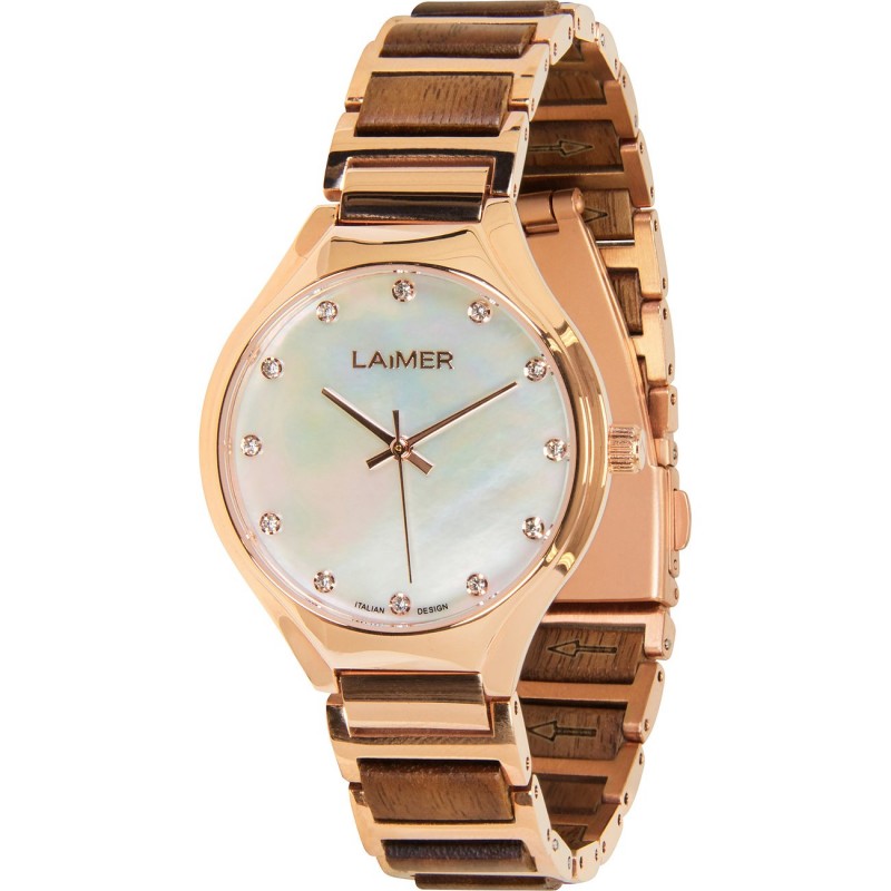 Diese extravagante Damenarmbanduhr von LAiMER zeichnet sich vor allem durch ihre intensiven Weisstöne in Kombination mit den strahlenden Schmucksteinen aus, welche durch das schillernde Perlmuttzifferblatt besonders gut zur Geltung kommen. Die Nussbaumholz Elemente im Uhrband sorgen im Zusammenspiel mit dem geringen Gewicht der Uhr für einen hohen Tragekomfort.