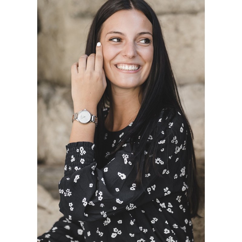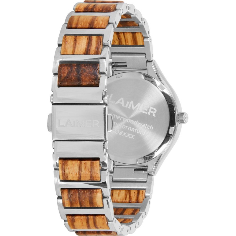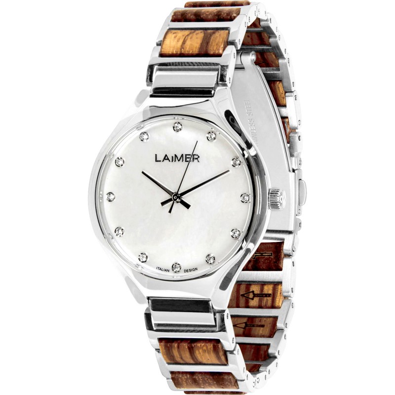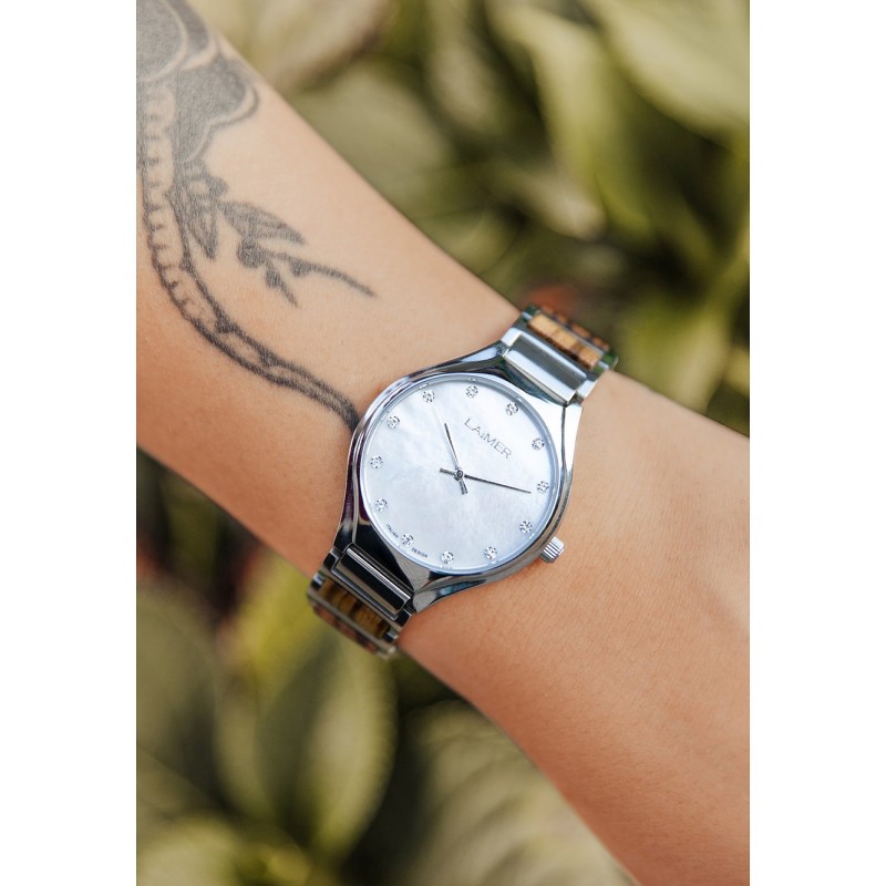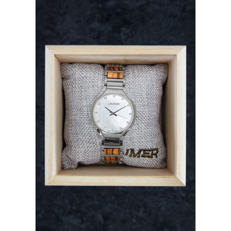 Diese extravagante Damenarmbanduhr von LAiMER zeichnet sich vor allem durch ihre intensiven Weisstöne in Kombination mit den strahlenden Schmucksteinen aus, welche durch das schillernde Perlmuttzifferblatt besonders gut zur Geltung kommen. Die Zebranoholz Elemente im Uhrband sorgen im Zusammenspiel mit dem geringen Gewicht der Uhr für einen hohen Tragekomfort.