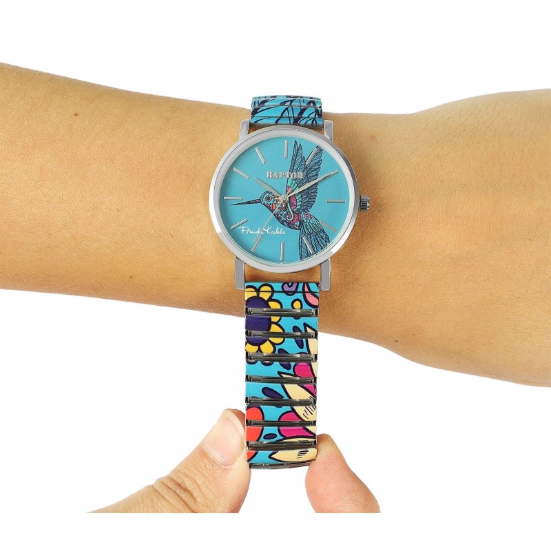 Die „Raptor X Frida Kahlo“ Zugbanduhr zeigt die ikonische Kunst und Persönlichkeit der mexikanischen Malerin auf eine einzigartige Weise. Diese Uhr ist eine Hommage an Frida Kahlos lebendige Farben, ihre ausdrucksstarken Selbstporträts und die charakteristische Natur ihrer Werke.