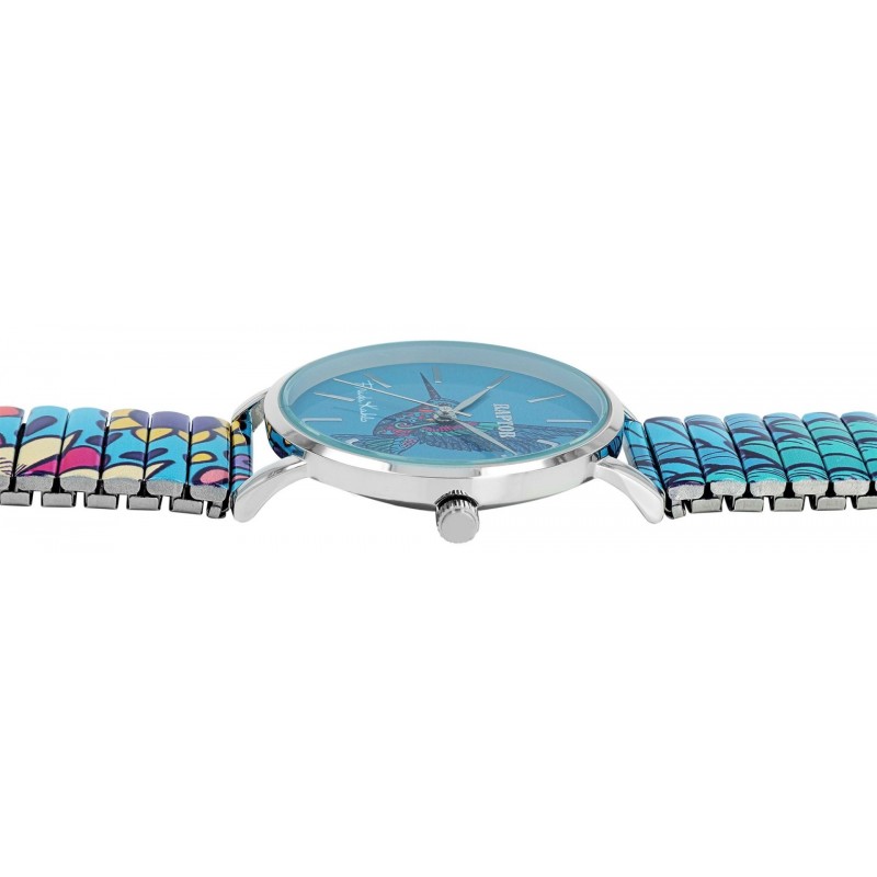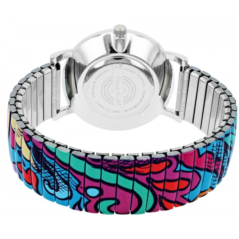 Das Zifferblatt mit Strichindex präsentiert sich wie eine Leinwand, auf der sich die Motive Frida Kahlos entfalten. Die Farben umfassen lebhafte Nuancen wie Blau, Rot, Grün oder Gelb, die perfekt angeordnet sind. In dieser Pracht finden sich Verweise auf die berühmten Gemälde von Frida Kahlo. Mit den kunstvollen Details erhält die 3 Zeiger Uhr eine unverkennbare künstlerische Identität und machen sie zu einem tollen Blickfang.