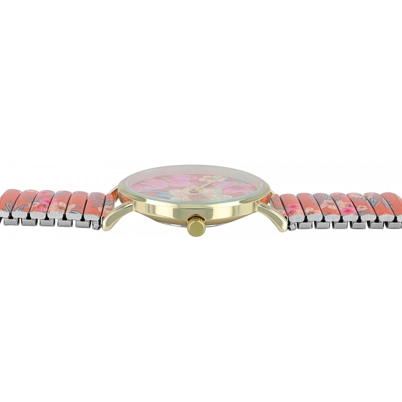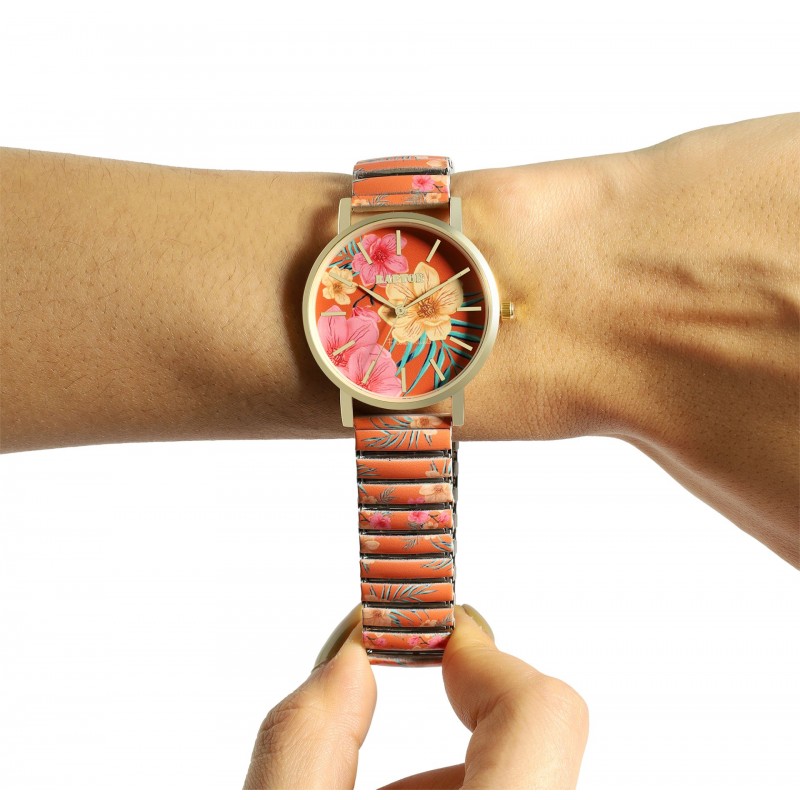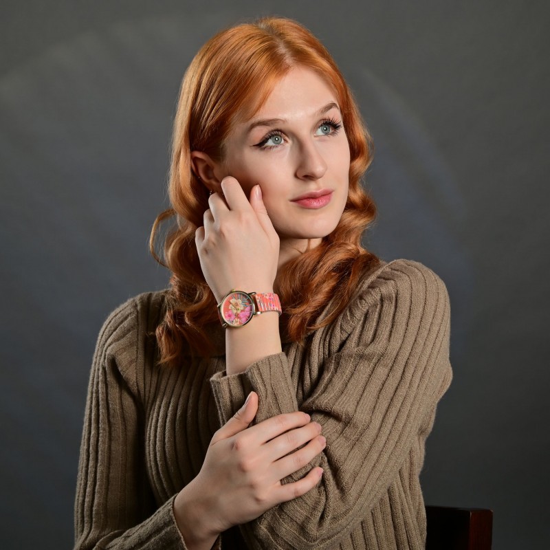 Das Zifferblatt mit Strichindex präsentiert sich wie eine Leinwand, auf der sich die Motive Frida Kahlos entfalten. Die Farben umfassen lebhafte Nuancen wie Blau, Rot, Grün oder Gelb, die perfekt angeordnet sind. In dieser Pracht finden sich Verweise auf die berühmten Gemälde von Frida Kahlo. Mit den kunstvollen Details erhält die 3 Zeiger Uhr eine unverkennbare künstlerische Identität und machen sie zu einem tollen Blickfang.