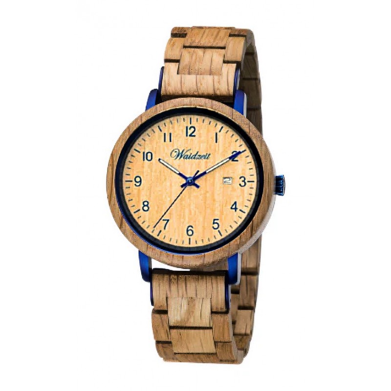 Die Waidzeit-Herrenuhr Markus vereint traditionelles Handwerk mit modernem Understatement. Gefertigt aus charaktervollem Eichenholz, beeindruckt sie durch ihr puristisches Design in Eiche und royalblauen Elementen am Ziffernblatt, Krone und Bandansatz und ein harmonisch abgestimmtes Echtholz-Ziffernblatt – ebenfalls aus hochwertigem Eichenholz gefertigt. Die natürliche Maserung macht jede Holzuhr zu einem Unikat.