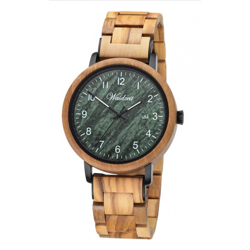 Die Waidzeit-Herrenuhr Matthias vereint mediterrane Natürlichkeit mit stilvoller Präsenz. Gefertigt aus edlem Olivenholz, besticht sie durch ihre warme Farbgebung und die lebendige Maserung – jedes Modell ein Unikat. Das Ziffernblatt aus echtem grünem Marmor setzt einen markanten Kontrast und verleiht der Uhr eine zeitlose, ruhige Ausstrahlung.