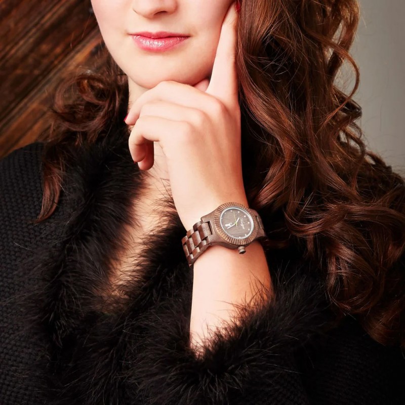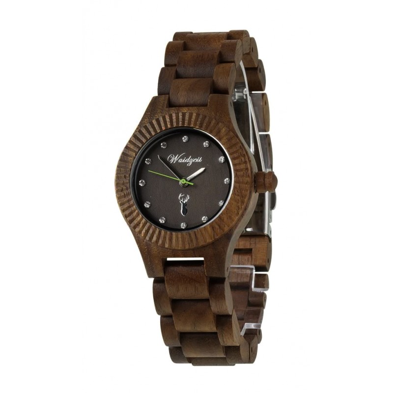 Klassische Eleganz zeichnet das Modell Gams von Waidzeit aus edlem Walnussholz aus. Diese Armbanduhr für Damen verfügt über ein Ziffernblatt mit eingearbeiteten Kristallsteinen und einem grasgrünen Sekundenzeiger. Sie ist nicht nur wunderschön zu tragen, sondern auch absolut angenehm leicht! Damit ist die Frau von Welt mit einem wunderbaren Stück Natur ausgestattet.